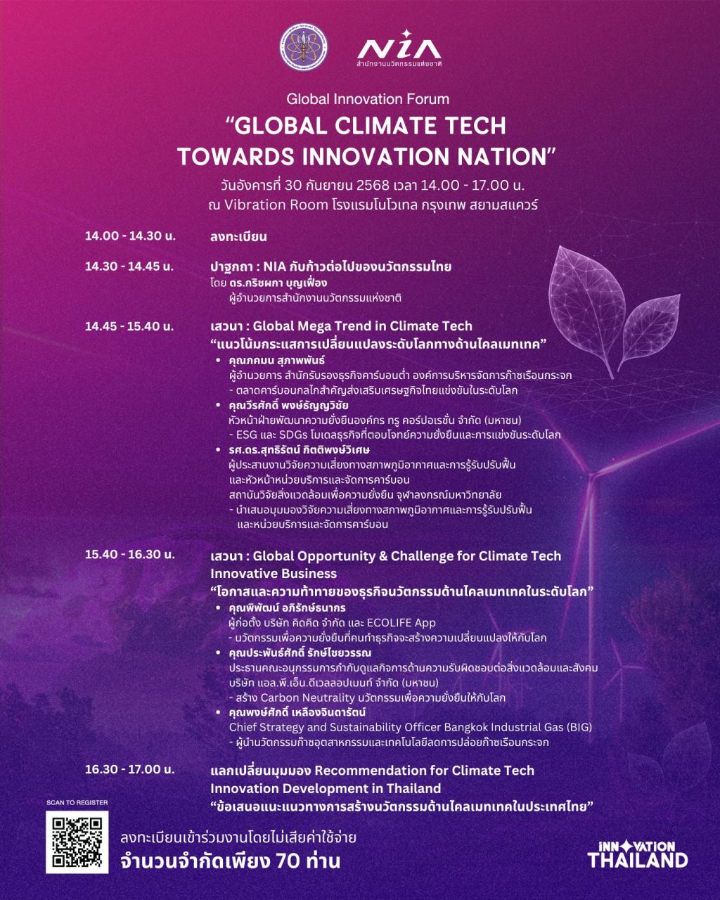 วันอังคารที่ 30 กันยายน 2568 เวลา 14.00 - 17.00 น. Vibration Room โรงแรมโนโวเทล กรุงเทพ สยามสแควร์ พบการเสวนาจากผู้นำในแวดวง Climate Tech ครอบคลุมประเด็น Global Mega Trend, Business Opportunity & Challenge และข้อเสนอแนะการพัฒนา Climate Tech ในประเทศไทย เวทีสำคัญในการแลกเปลี่ยนมุมมองระดับโลกด้าน Climate Tech เพื่อร่วมกันผลักดันนวัตกรรมไทยสู่ระดับโลก ลงทะเบียนร่วมงาน : https://docs.google.com/forms/d/e/1FAIpQLSdrJ7L0UVq0zz3X6utz7uX43TZ6Hm3Mrh-6j44S_qd-nv8_kQ/viewform