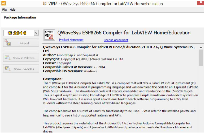 ESP8266 LabVIEW Library คือ ไลบารี่พิเศษที่พัฒนาโดย Q-Wave Systems Co.,Ltd ให้สามารถโปรแกรมโค้ด LabVIEW ลงในฮาร์ดแวร์ ESP8266 (WiFi SoC) ใช้งานแบบ Embedded Appliation ได้ทันที โดยผู้อ่านสามารถดาวน์โหลดไฟล์ติดตั้งได้จาก http://ftp.iosys.link/repository/ เลือกดาวน์โหลดไฟล์ล่างสุดที่มีนามสกุล “.vip” (*เป็นไฟล์ที่มีนามสกุลของ VIPM ซอฟต์แวร์ เป็นตัวจัดการติดตั้ง Toolkit ต่างๆ ใน LabVIEW) ตัวอย่างเช่น “q_wave_systems_lib_esp8266_home_education-1.0.0.7” โดย ณ วันที่เขียนบทความ เวอร์ชันล่าสุดคือ 1.0.0.7 (*กรุณาตรวจสอบเวอร์ชันใหม่ๆ อยู่เสมอ) เมื่อดับเบิ้ลคลิกเพื่อติดตั้งจะแสดงหน้าต่างดังนี้ และเมื่อติดตั้งเสร็จสมบูรณ์สามารถเรียกใช้งานไลบารี่ต่างๆ ได้จาก LabVIEW Function Pallet แสดงดังรูปที่ 11
